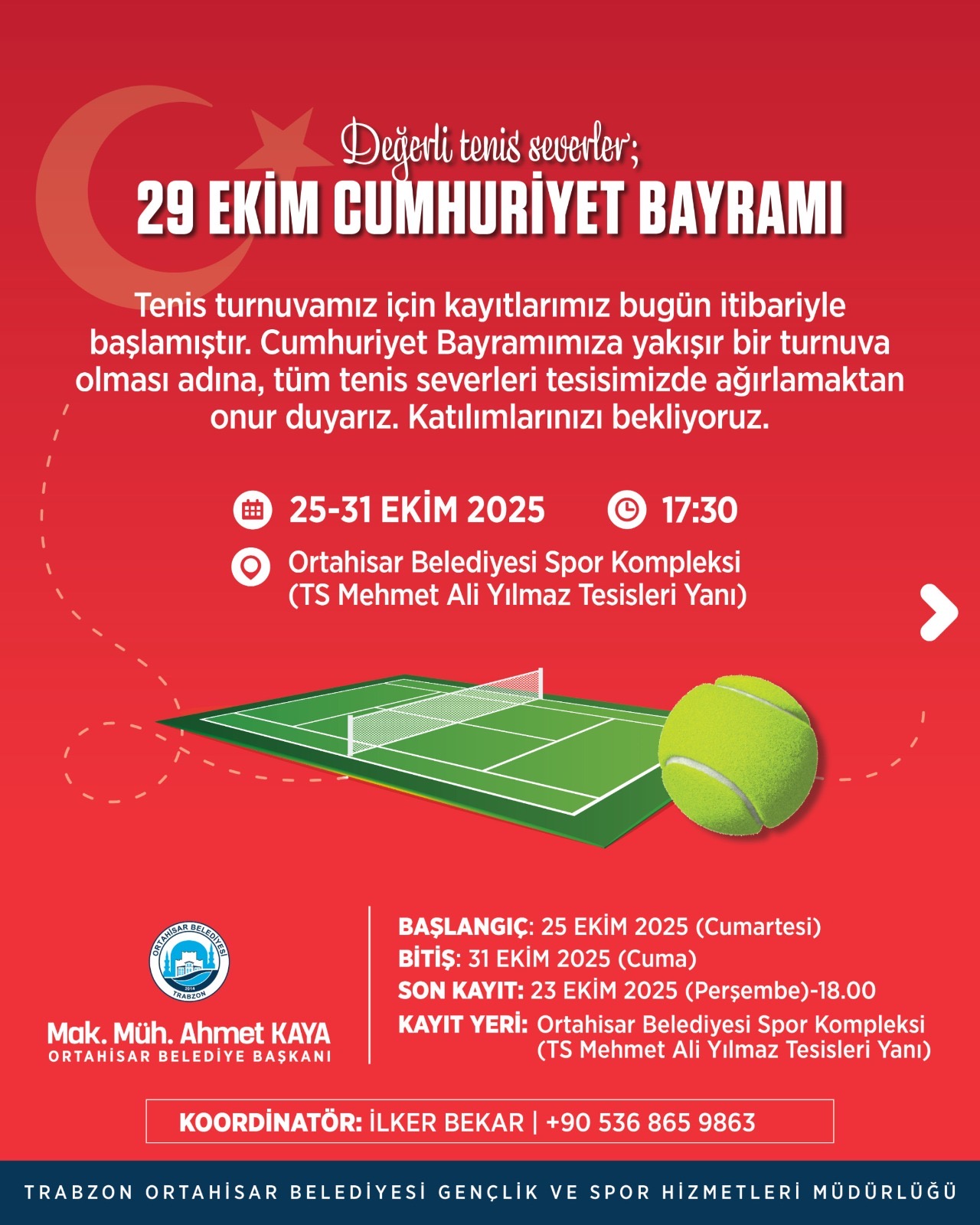 Ortahisar Belediyesi tarafından, 29 Ekim Cumhuriyet Bayramı kutlamaları kapsamında düzenlenecek tenis turnuvası için kayıtlar başladı. Belediye Başkanı Ahmet Kaya, bütün tenis severleri bu heyecan dolu turnuvaya katılmaya davet etti.