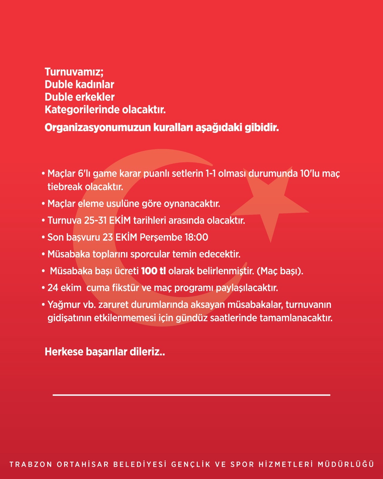 Sporun her dalına destek vererek farklı branşlarda etkinliklere imza atan Ortahisar Belediyesi, 29 Ekim Cumhuriyet Bayramı’nın 102. yılı dolayısıyla, 29 Ekim Cumhuriyet Bayramı Tenis Turnuvası düzenleyecek. Ortahisar Belediyesi Spor Kompleksi’nde 25 Ekim-31 Ekim tarihleri arasında gerçekleştirilecek turnuva için 17 Ekim tarihinde başlayan başvurular, 23 Ekim Perşembe günü saat 18.00’a kadar sürecek. Kayıtlar, Ortahisar Belediyesi Spor Kompleksi’nde yapılacak.