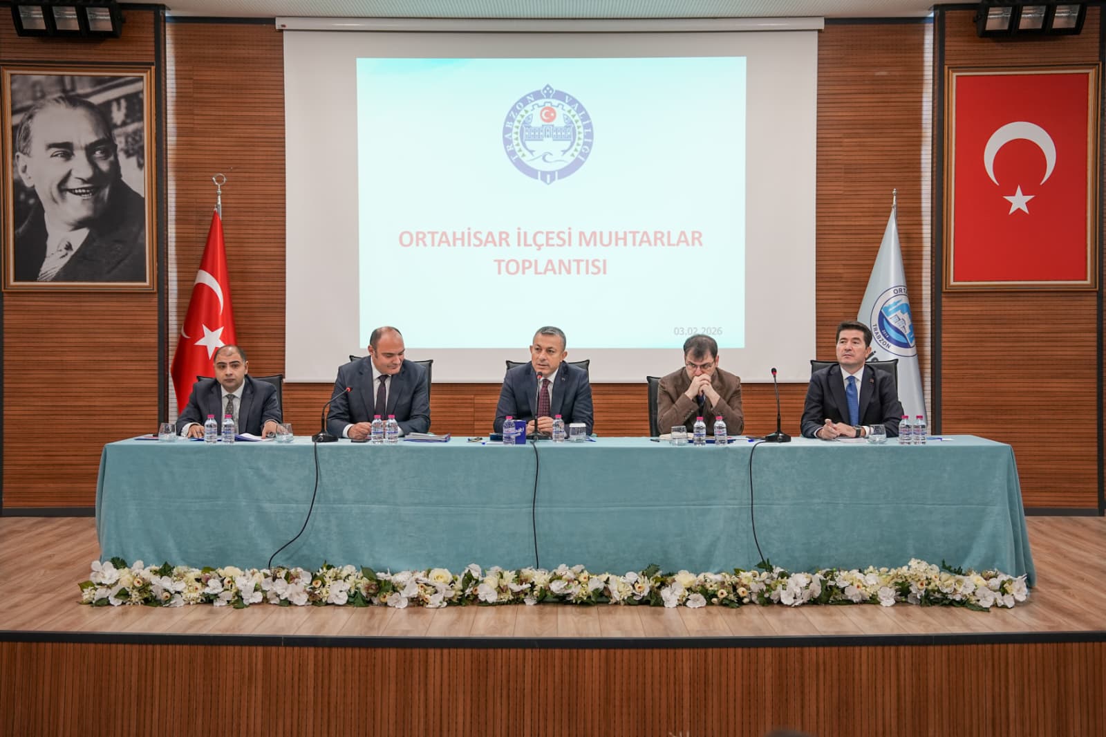 Ortahisar Belediyesi’nin ev sahipliğinde düzenlenen ‘Ortahisar İlçesi Muhtarlar Toplantısı’, Ortahisar Belediyesi Orhan Karakullukçu Salonu’nda yapıldı. Trabzon Valisi Tahir Şahin’in başkanlığında yapılan toplantıya; Ortahisar Belediye Başkanı Ahmet Kaya, Trabzon Büyükşehir Belediyesi Genel Sekreteri Gürkan Üçüncü, Ortahisar Kaymakamı Gürkan Demirkale, Vali Yardımcısı Fatih Kızıltoprak, İl Jandarma Komutanı Tuğgeneral Bahittin Murat Yakın, İl Emniyet Müdürü Ali Loğoğlu, Ortahisar Belediye Başkan Yardımcıları Cüneyit Zorlu, Celal Akaç, Alper Öztürk, Mustafa Özer İskender ve Ernul Arslan, Sahil Güvenlik Doğu Karadeniz Grup Komutanı Binbaşı Aytaç Bayırlı, Trabzon Muhtarlar Federasyonu ve Ortahisar Muhtarlar Derneği Başkanı Bekir Aktürk, Belediye Meclis Üyeleri, Ortahisar Belediyesi birim müdürleri, kamu kurumlarının müdür ve temsilcileri ile Ortahisar’da görev yapan mahalle muhtarları katıldı.