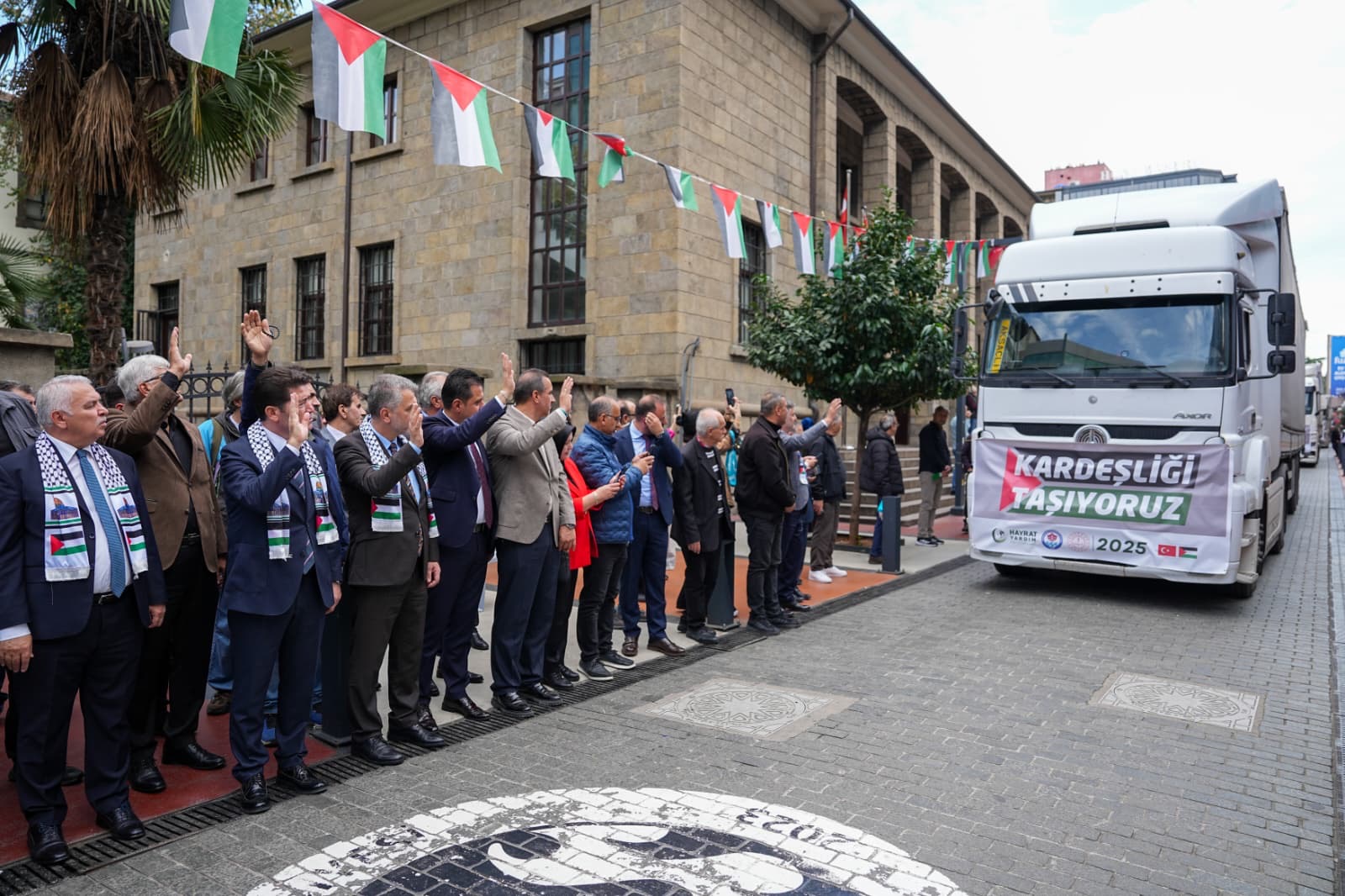 Programda daha sonra Hayrat Yardım Vakfı, Trabzon İl Milli Eğitim Müdürlüğü ve Trabzon Büyükşehir Belediyesi’nin organizasyonuyla düzenlenen kampanyada toplanan yardım malzemeleri, dualar eşliğinde TIR’larla Gazze’ye uğurlandı. Dumlupınar İlkokulu’ndan 100 öğrenci tarafından yazılan mektuplar da konvoyla birlikte Gazze’ye gönderildi.