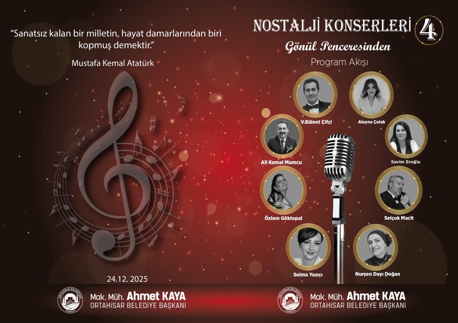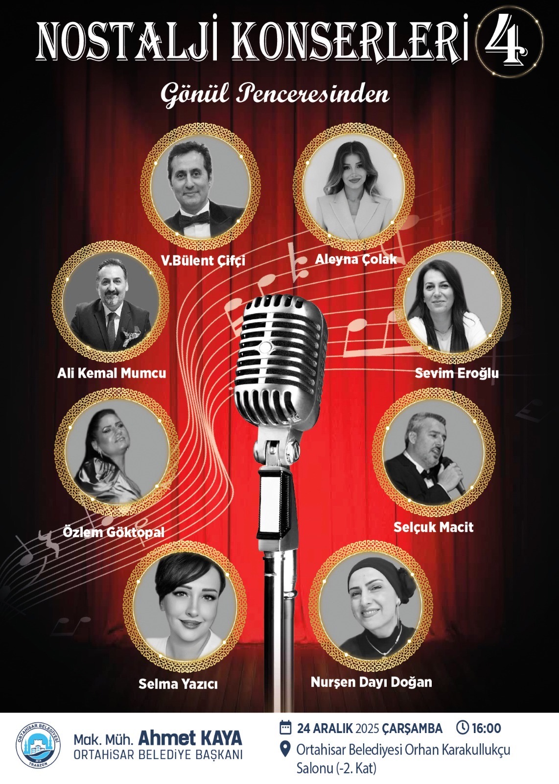 Ortahisar Belediyesi, müzikseverlerin hafızalarında derin izler bırakan, Türk sanat müziğinin unutulmaz eserlerinin seslendirileceği Nostalji Konserleri’nin dördüncüsünü, ‘Gönül Penceresinden’ temasıyla 24 Aralık Çarşamba düzenleyecek.