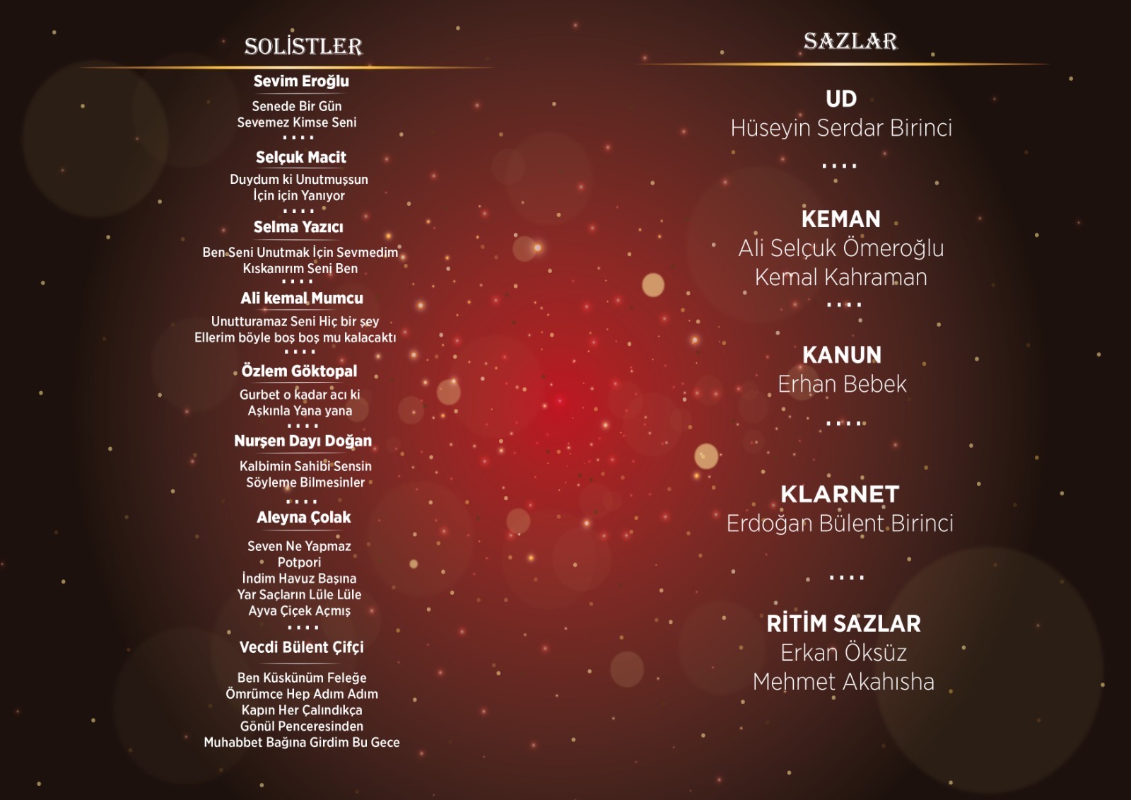 Türk sanat müziğinin unutulmaz eserlerinin seslendirileceği konser, 24 Aralık 2025 Çarşamba günü saat 16.00’da, Ortahisar Belediyesi Orhan Karakullukçu Salonu’nda (-2. Kat) gerçekleştirilecek. Konserde; solistler Vecdi Bülent Çifçi, Aleyna Çolak, Ali Kemal Mumcu, Sevim Eroğlu, Selçuk Macit, Özlem Göktopal, Selma Yazıcı ve Nurşen Dayı Doğan sahne alacak. Ud, keman, kanun, klarnet ve ritim sazlardan oluşan güçlü saz heyeti de sanatçılara eşlik edecek. Konserde; “Gönül Penceresinden”, “Senede Bir Gün”, “Kalbimin Sahibi Sensin”, “Ben Küskünüm Feleğe”, “İndim Havuz Başına” gibi Türk sanat müziğinin dillerden düşmeyen eserlerinin de aralarında bulunduğu birbirinden güzel şarkılar seslendirilecek.