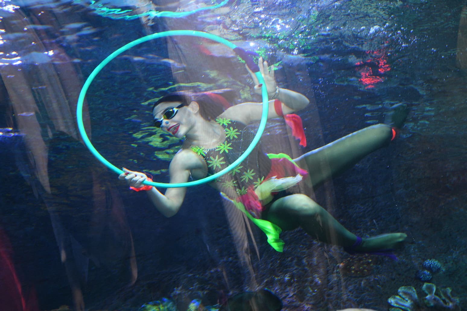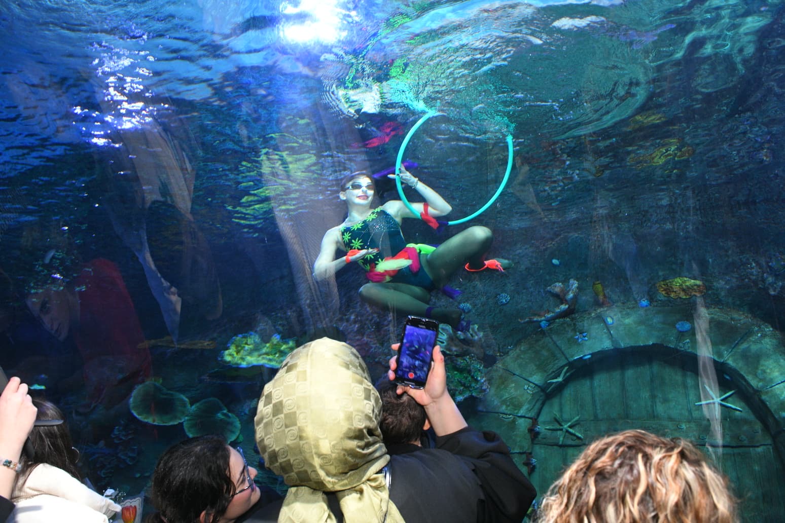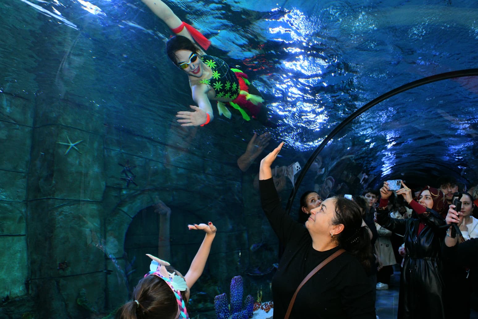 Tüpsüz şekilde balıklarla dolu akvaryuma giren sporcu, 10 dakika boyunca etkileyici bir performans sergiledi. Halkanın içinden geçme, sıçrama, ters dönme gibi su balesi tekniklerini sergileyen Deniz Kızı’nın performansına alkışlarla eşlik eden ziyaretçiler, büyüleyici gösteriyi telefonlarla görüntüleyerek kayıt altına aldı. Kendisini alkışlayan ziyaretçileri selamlayan sporcu, akvaryumun camına yaklaşarak çocuklarla fotoğraf çekildi.