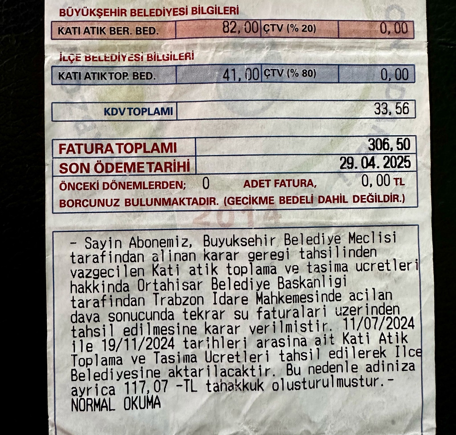 Katı atık bedellerinin su faturaları ile toplanmasının kanuni bir zorunluluk olduğunun altını çizen Zorlu, “Hal böyle iken Trabzon Büyükşehir Belediyesi, Ortahisar Belediyesi’ni yeniden su faturalarına tahakkuk ettirilen katı atık bedelinin sorumlusu olarak göstermeye çalıştı. Buradan soruyorum, Maçka’ya giden faturada, ‘Ortahisar Belediyesi’ ifadesi neden yazılıyor? Maçka’daki abonenin ödediği katı atık bedelini, biz mi alıyoruz? Hayır, Maçka Belediyesi alıyor. Ayrıca katı atık bedelini sadece Ortahisar Belediyesi mi alıyor? Hayır, bütün ilçe belediyeleri alıyor. Ayrıca kıymetli vatandaşlarımıza şunu hatırlatmak istiyorum, katı atık bedelini sadece ilçe belediyeleri almıyor. Elimizdeki 306 TL’lik faturanın 87,5 TL’si Büyükşehir Belediyesi’nin aldığı katı atık bedelidir. İlçe belediyesi ise 41.00 TL almaktadır. Aynı faturada ayrıca 18,49 TL de bakım ücreti vardır. 1 Ocak 2025 tarihinde suya 2,10 lira zam yaparak metreküp fiyatı 19,92 liraya, 16 metreküp ve üzeri ise 24,90 liraya çıkarılmış. Eğer Büyükşehir Belediyesi su faturalarındaki yüksek tutarları düşürmek istiyorsa diğer belediyeler gibi su faturalarına zam yerine indirim yapabilir, bakım ücretini almayabilir ya da düşürebilir. Katı atık bedellerinin tahsil edilmesinin başka yolu yokken, burada ‘Ortahisar Belediyesi bu tahsilatı yapamasın ve bütçe dengeleri sarsılsın mı?’ diye isteniyor düşünmeden edemiyoruz. Niyetin bu olduğunu görüyoruz ve vatandaşımızın da dikkatine sunuyoruz” şeklinde konuştu.