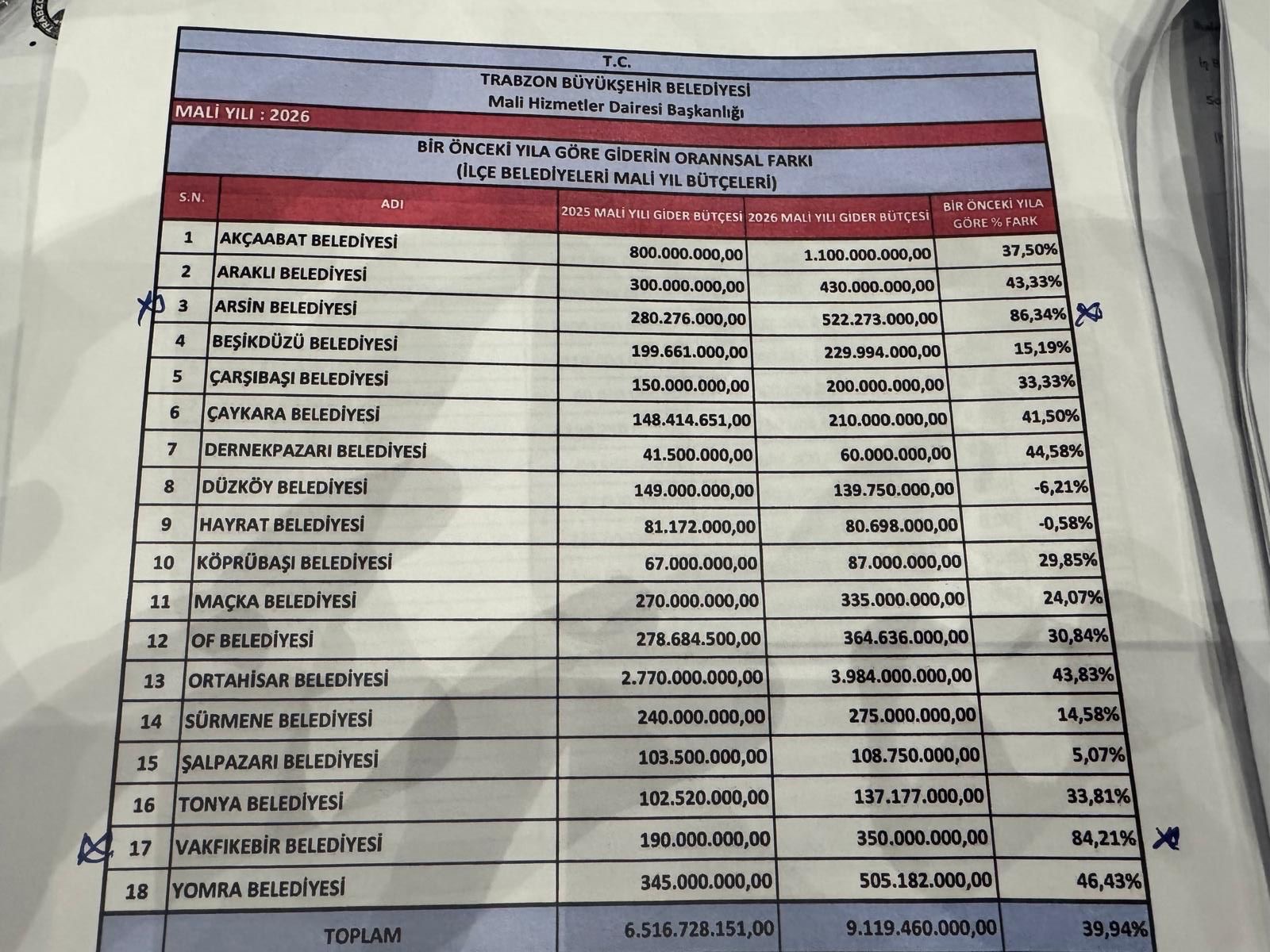 Vakfıkebir ve Arsin Belediyelerinin bütçelerindeki anormal artışları da gündeme getiren Zorlu, “Bütçe rakamlarındaki anormal artışların, bu iki belediyenin AK Parti’ye geçmesiyle ilgisinin olup olmadığını soran Zorlu, “İlçelerdeki belediyelerin bütçeleri arasındaki oransal farkı gösteren rakamlara bakıyorum, başka partilerden sizin partinize geçen belediyelerin gelirlerinde bir önceki yıla göre ciddi artışlar var. Bu artışların nedeni nedir? Mesela Vakfıkebir’in bütçesi bir önceki yıla göre yüzde 84, Arsin’in ise yüzde 86 artmış. Diğer belediyeler arasında en fazla bütçe artışı, yüzde 46” diyerek bu farkın nereden kaynaklandığını sordu.
