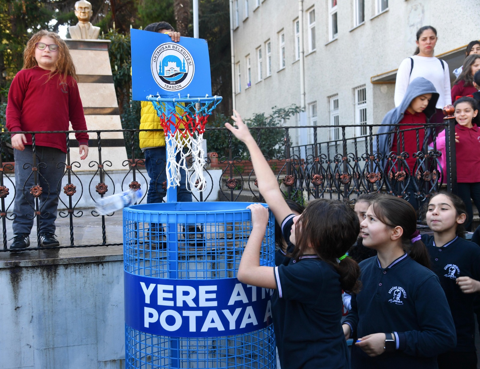 Ortahisar Belediye Başkan Yardımcısı Mustafa Özer İskender, sıfır atık yaklaşımının yalnızca atık miktarını azaltmayı değil, aynı zamanda iklim değişikliğinin etkilerini hafifletmeyi, doğal kaynak tüketimini azaltmayı ve gelecek nesillere daha sağlıklı bir çevre bırakmayı hedeflediğini söyledi. Sürdürülebilir bir yaşam için materyallerin geri dönüşümünün çok önemli olduğunu belirten İskender, “Çocuklarımızı hem spora teşvik etmek hem de atık biriktirmeye katkı sağlamak için 50 adet atık potasını okullarımıza teslim edeceğiz. Bu kapsamda ilk atık potamızı Atatürk Orta Okulu’na hediye ettik. ‘Yere Atma, Potaya At’ diyoruz ve bütün öğrencilerimizi geri dönüşüm materyallerini bu potalara atmaya davet ediyoruz” dedi.