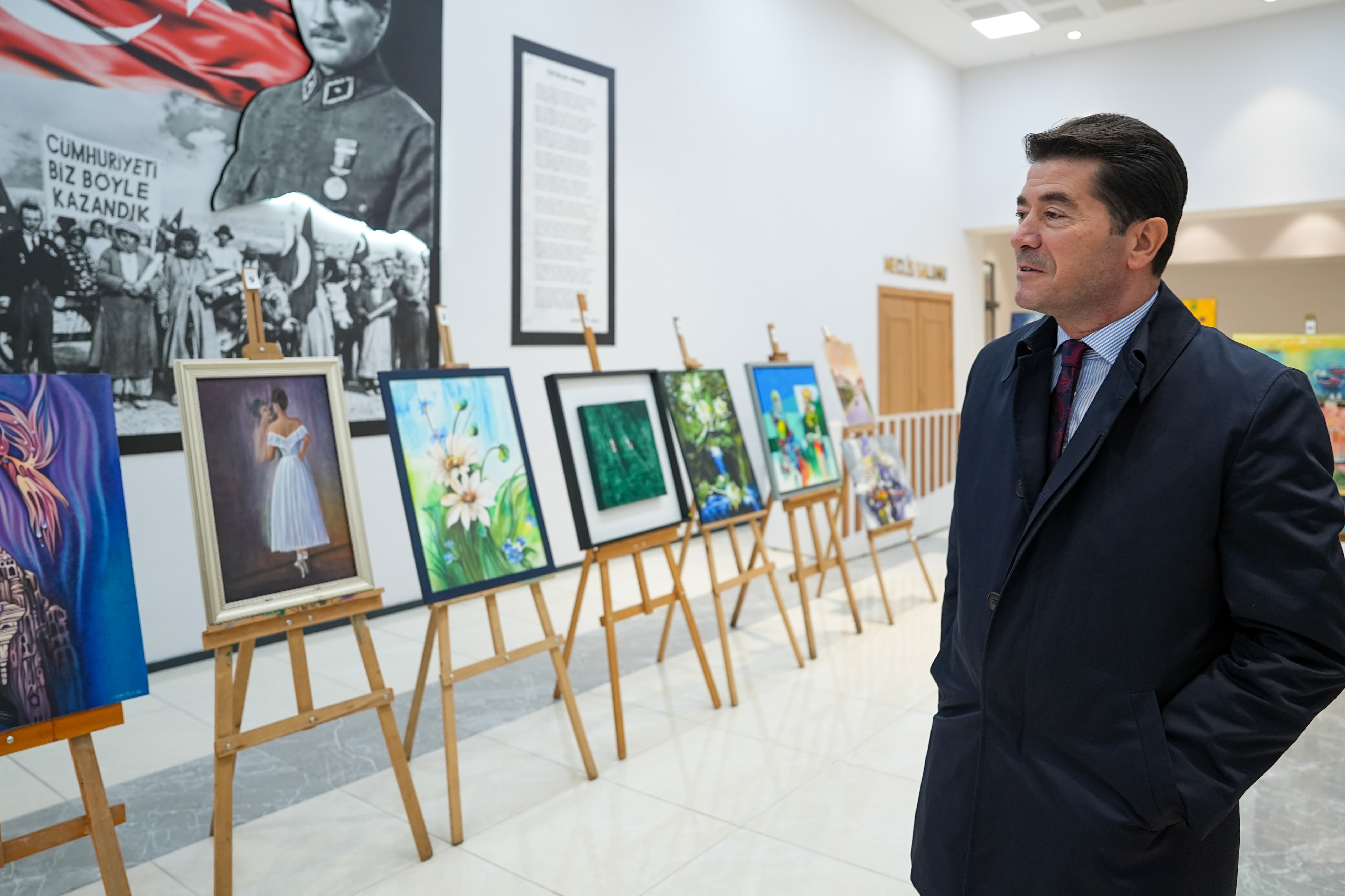 Burs verilen öğrenci sayısını artırma hedefinde olduklarını ifade eden Başkan Kaya, “Bize müracaat eden, ekonomik sıkıntıda olan bütün ihtiyaçlı yavrularımıza el uzatalım istiyoruz. Bu anlamda bizi destekleyen, yalnız bırakmayan bütün dostlarıma çok teşekkür ediyorum. Bugün de iş insanlarımızı, sanatçılarımızı, dostlarımızı sergimize davet ettik. Sergide benim de ‘karalama’ olarak nitelendirdiğim birkaç resmim var. Ortaokuldaki resim bilgimle, sırf bu işe katkı olsun diye yapmaya çalıştığım resimler… Ama çok değerli sanatçılarımızın, çok güzel resimleri de var. Onları da sizlerin beğenisine sunduk. Buradan elde edilen bütün gelir, öğrencilerimize, yavrularımıza burs olarak aktarılacak. Şu anda 46 üniversiteden 107 öğrencimize burs veriyoruz ama bu sayıyı artıracağız. Herkesten destek bekliyoruz. Katkı sağlayan herkese da teşekkür ediyoruz” diye konuştu.