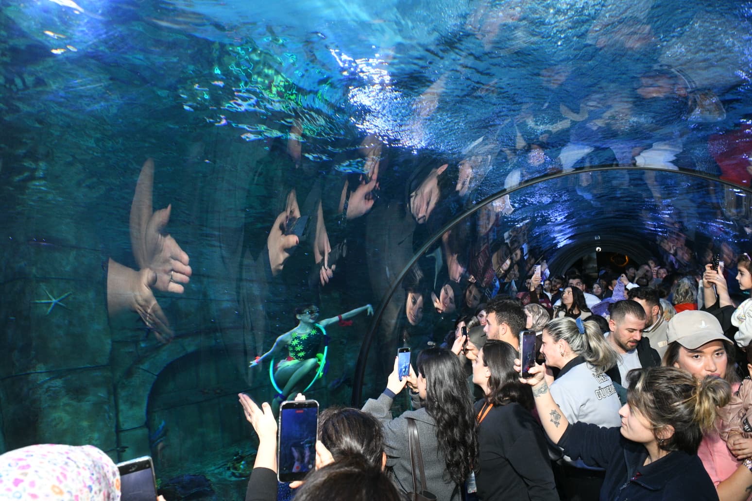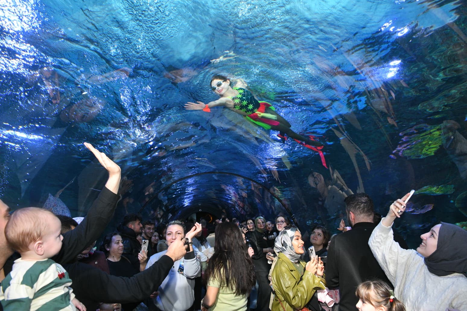 Tüpsüz şekilde balıklarla dolu akvaryuma giren sporcu, 10 dakika boyunca etkileyici bir performans sergiledi. Halkanın içinden geçme, sıçrama, ters dönme gibi su balesi tekniklerini sergileyen Deniz Kızı’nın performansına alkışlarla eşlik eden ziyaretçiler, büyüleyici gösteriyi telefonlarla görüntüleyerek kayıt altına aldı. Kendisini alkışlayan ziyaretçileri selamlayan sporcu, akvaryumun camına yaklaşarak çocuklarla fotoğraf çekildi.